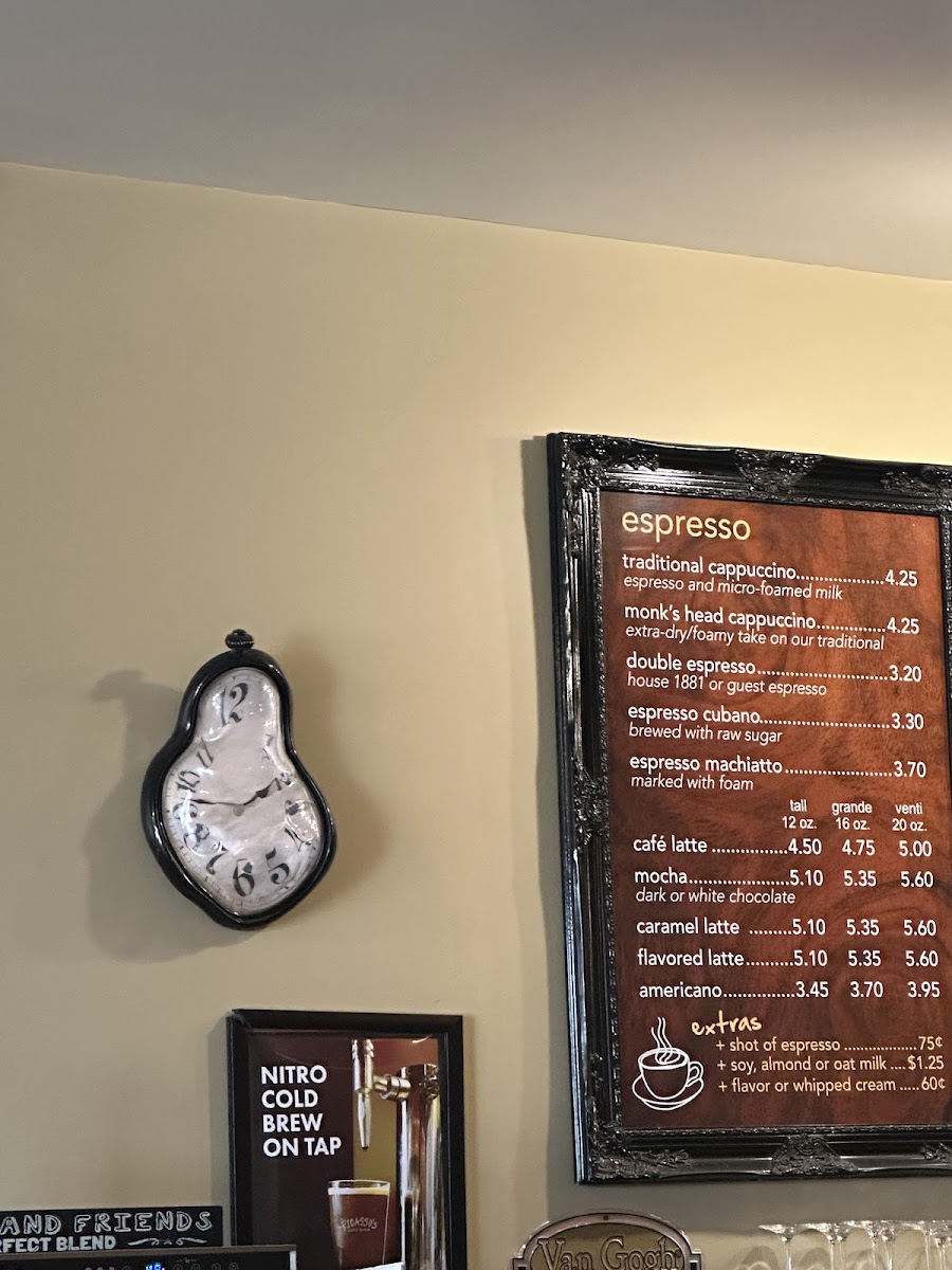 The menu offers a variety of coffee and espresso beverages, including specialty drinks such as cappuccinos, cortados, nitro cold brews, iced mochas, and espresso doubles. Non-coffee options like frappés without coffee and diverse tea blends are also available. For those interested in alcoholic beverages, the menu features a selection of wines, including Moscato from Washington, Cortese from Italy, and Monastrell from Spain, as well as beer options.